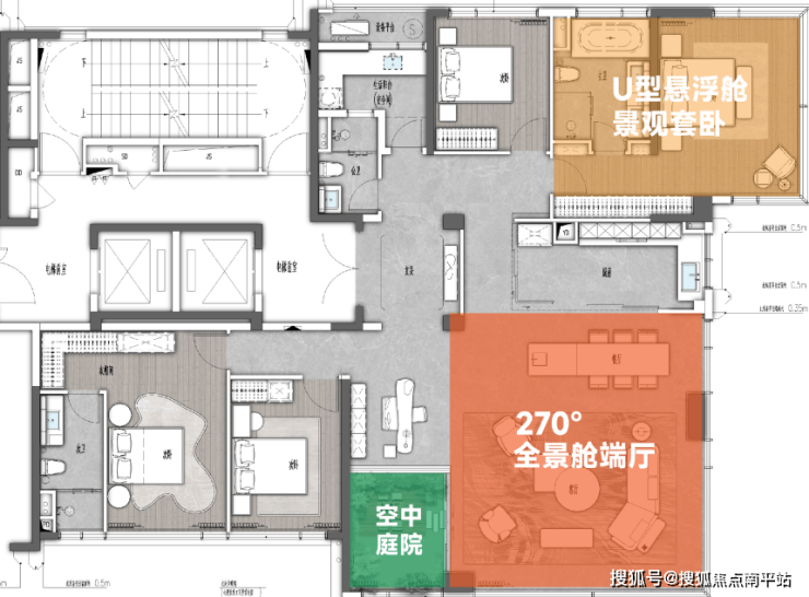为了最大化景观视野,锦宸不仅为其配置了全景视野户型,更打造出市面罕有的“墅级空中庭院”。
