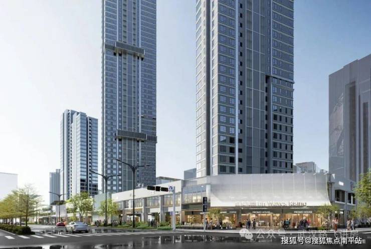 从效果图观察,项目外立面采用类公建化设计,造型颇具特色。其配备四维玻璃立面,让楼体从四个角度望去均呈现正面视觉效果,玻璃选用三层中空LOW-E镀膜材质,具备隔音与隔热性能。