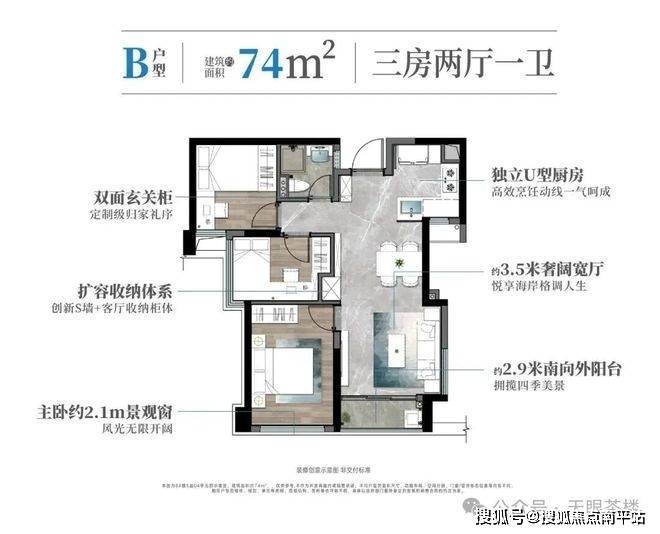 约74平3房,综合使用率高达约88%,采光好;舒适三房,最小房间都有约8平;客厅面宽达约3.5米,超大U型厨房,独立阳台,入户玄关柜+S墙扩容收纳,堪称同级完美户型!