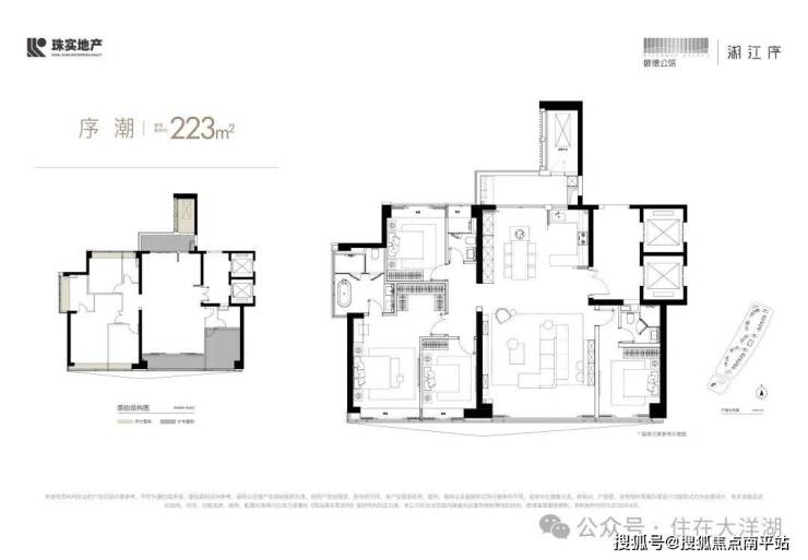 建筑面积约223㎡户型,辽阔总面宽、南向四开间、三面采光、主卧度假级套房、LDKB一体化设计等,雅契栋梁品位。