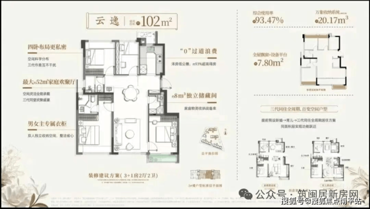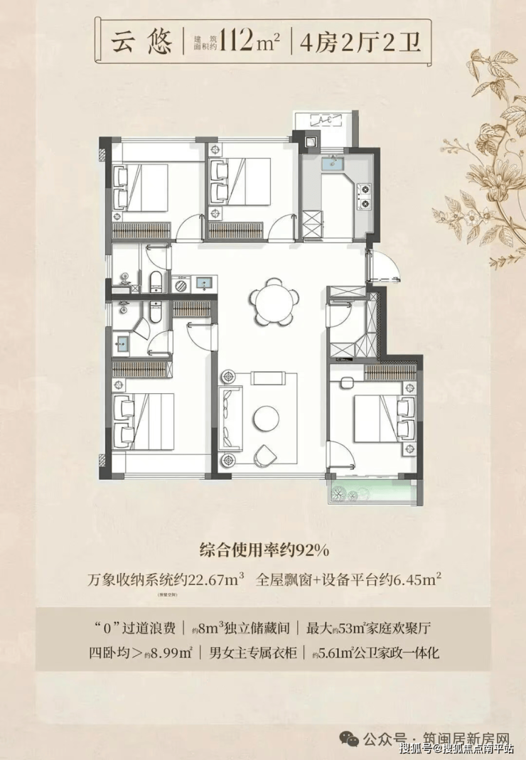 超高得房率是其最大亮点:89㎡得约91%,102㎡得约93.5%,112㎡得约92%。