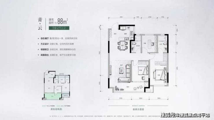 建面约 88 ㎡户型,市场上80+同类产品中少有的三房两卫产品, 比老规户型多出 10%赠送率 ,相当于目前市面上105 ㎡户型,可以说性价比非常高,这个户型就特别适合处在陪读阶段的家庭,家长和孩子都有非常充足的休憩空间。3.7m的客厅开间搭配 6.5 宽的南向双联阳台,尺度感十足。