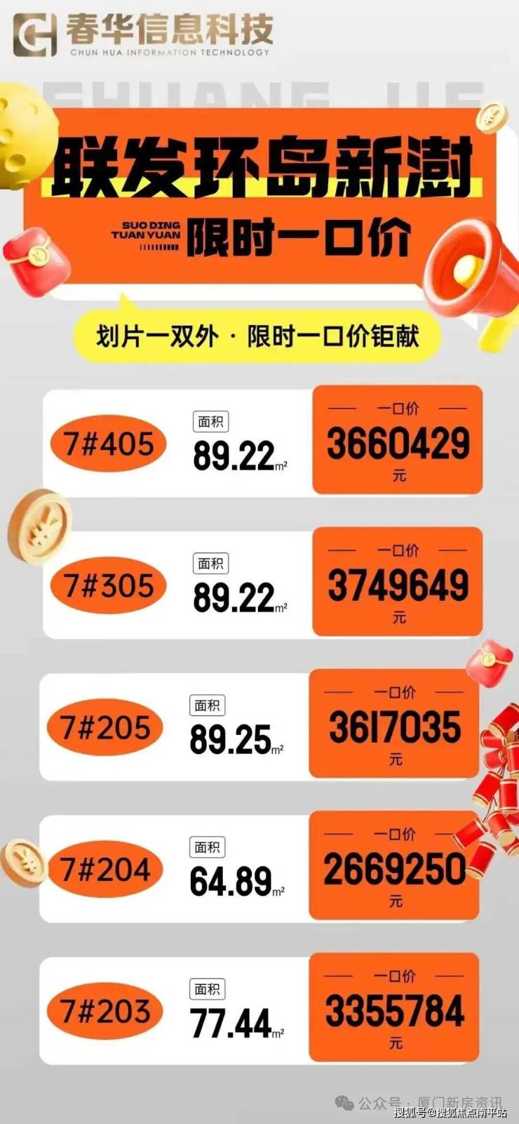 联发·环岛新澍 7#,折后4.23-4.63,均价4.5 10#1梯,折后4.56-5.07,均价4.9。