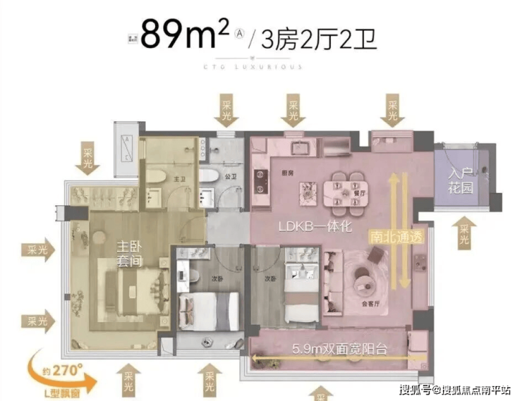 - 89㎡三房(130+万起):5.9米阔景阳台+LDK方厅,270°飘窗主卧,适配三口之家。