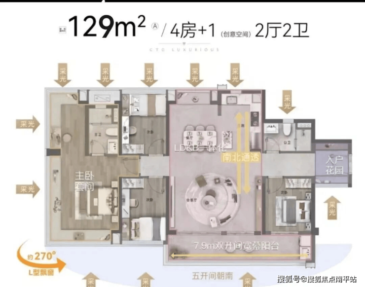 - 129㎡四房(240万起):五开间朝南+7.9米宽幕阳台,三代同堂舒适住。
