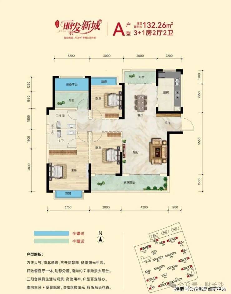 市场罕见2T3H、2T2H纯板式设计。超高赠送面积,多阳台、多飘窗设计,舒居首选。106-125-132-143-165㎡全龄户型,方正实用。