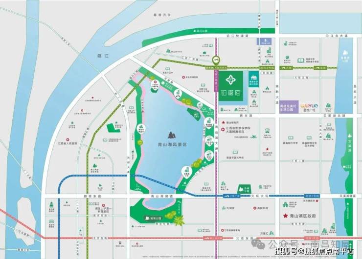直线 3 公里范围内教育、商业、医疗资源丰富,有多个幼儿园、小学、中学、商场,同时项目周边生态环境优越,青山湖风景区、丹霞公园双公园环绕,距离青山湖仅约 350 米。