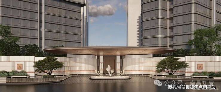 颜值即门庭:高奢度假酒店环岛式主入口,约109米宽超级城市界面,月光米黄、西班牙珊瑚红等打造的奢石景墙,与赣江波澜共谱造物之美;金边瑞香艺术水景潺潺;全铜铸铝大门,顶部造型铝板,呼应天圆地方,启合间共鸣身份尊荣。