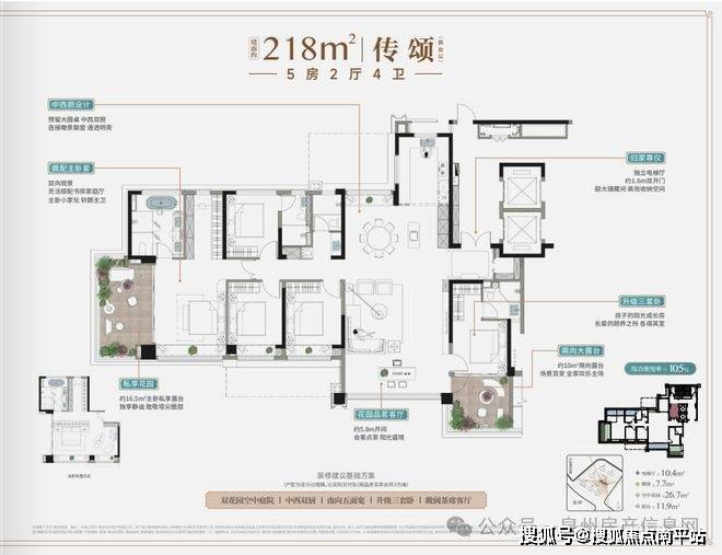 独立电梯厅与约1.6米宽入户双开门 ,奠定归家仪式感。 约5.8米横厅无缝衔接茶室 ,搭配中西双厨系统,构筑兼具接待力与家庭互动感的公共场域。 奢享三套卧设计, 从容安顿多代家庭成员,彼此尊重、互不干扰; 南北双露台 更将自然融入日常,实现居住与意境的共生。