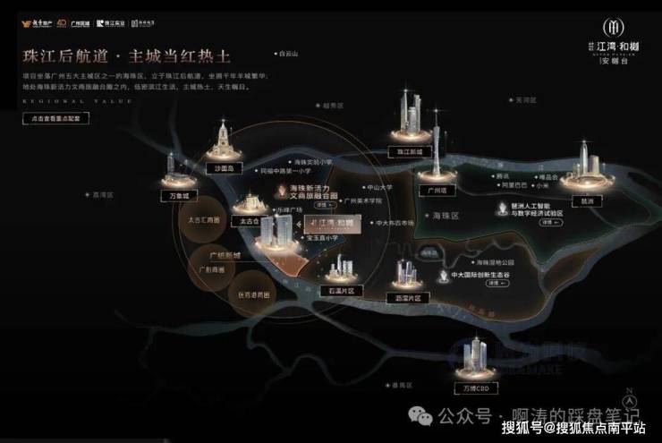 项目坐落广州主城海珠区,立于珠江后航道,坐拥千年羊城繁华;地处海珠新活力文商旅融合圈之内,低密滨江生活,主城热土,天生瞩目