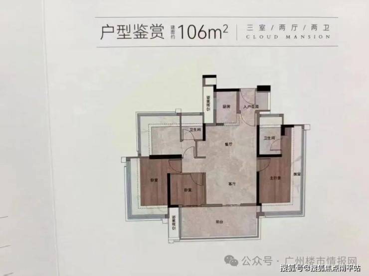建面约106㎡户型,东南朝向,比较大的优势就是,高层房源可以看到云山景观。