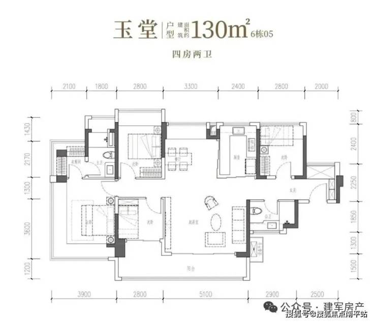 130㎡的4房2厅2卫,设计的是竖厅南北通透格局,进门独立玄关,客厅5.1米开间,客餐厅分离化设计,主卧270°无柱转角飘窗+衣帽间,分别做到了主卧23.66㎡/次卧11.2㎡/次卧8.96㎡/次卧7.84㎡(包含墙体飘窗),U型厨房烟道外置,卫生间干湿分离,得房率约101.95%(包含赠送),客厅连接次卧出超大阳台约14.09平,东北朝向。