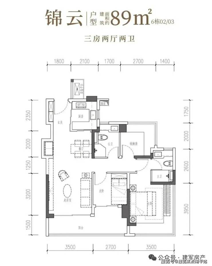 89㎡的3房2厅2卫,6栋02/03户型,设计的是经典竖厅格局,客厅3.5米开间,LDKB一体化,S墙设计预留冰箱卡槽位,三开间朝南,动静分区,主卧+次卧270°无柱转角飘窗,分别做到了主卧15.25㎡/次卧7.56㎡/次卧6.48㎡(包含墙体飘窗),U型厨房烟道外置,卫生间干湿分离,得房率约97.47%(包含赠送),客厅连接次卧出大阳台约11.46平,西南或东南朝向。主要区别在于次卧跟主卫空间。