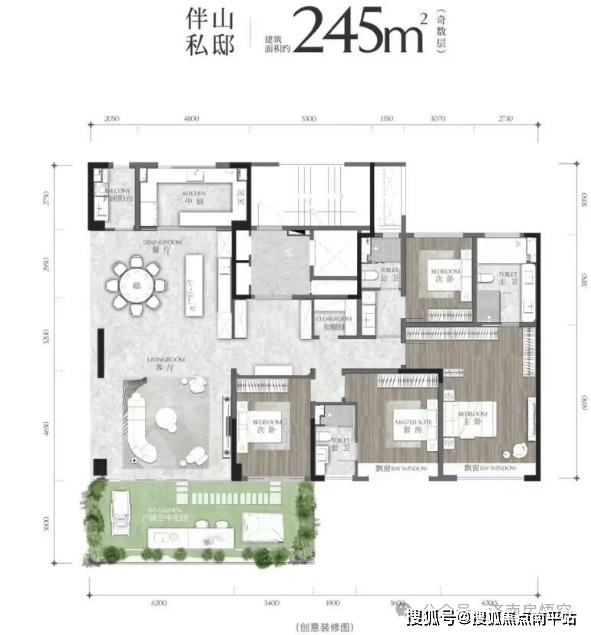 245㎡,四面宽,L形宽厅,客厅南向开间6.2米,东侧(奇数层)/南侧(偶数层)增加了30-36㎡的方正露台,南向露台进深约3.6米。