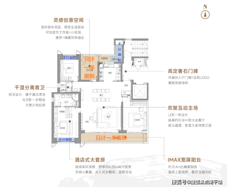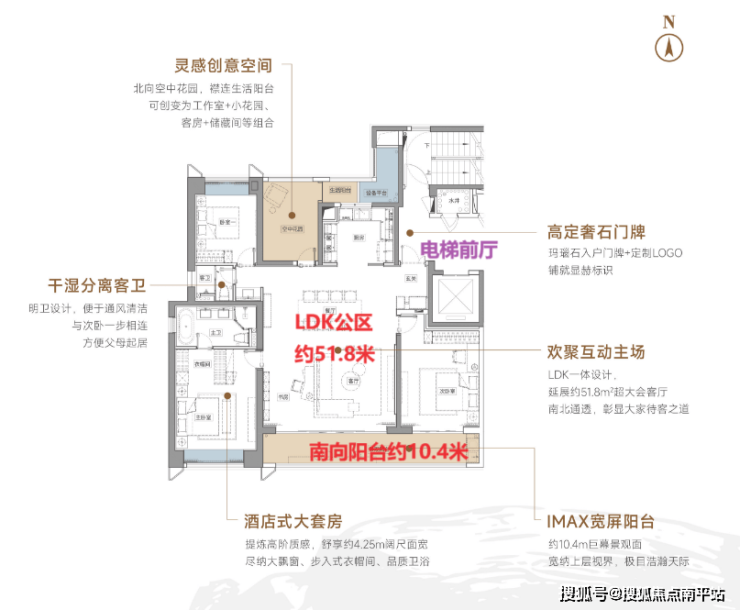 约51.8㎡LDK奢阔公区+约10.4米南向宽幕阳台,尺度感远超同面积段竞品,符合big house的想象。