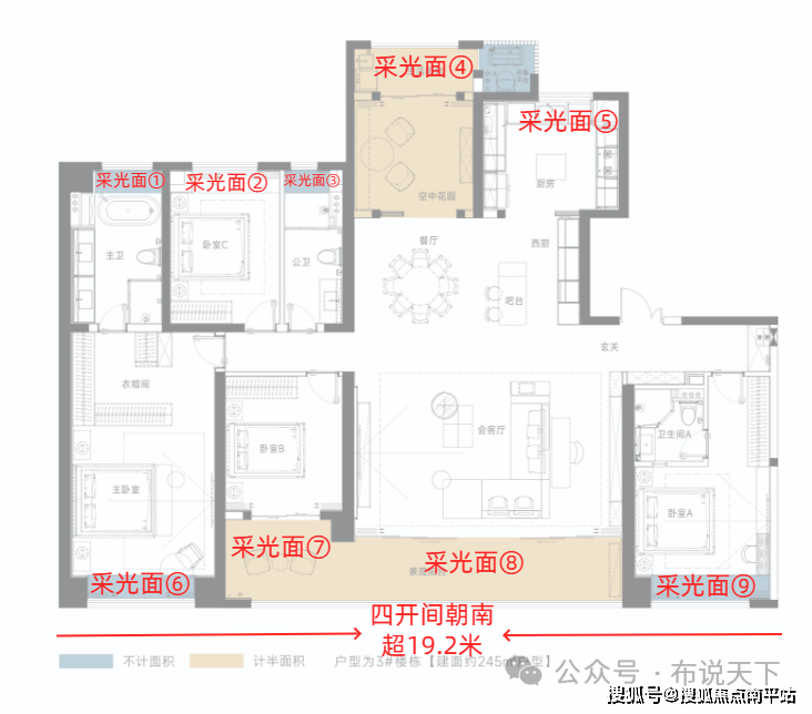 突破尺度:四开间朝南约 19.2米,全屋采光面达到了 9个。
