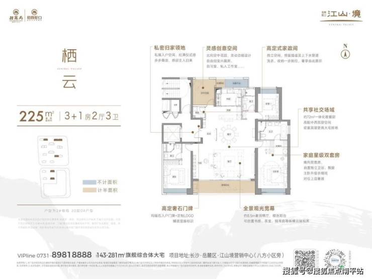 建面约225㎡:3+1房2厅3卫,独立入户门厅+LDKB大横厅+独立家政间,中西双厨空间,双套房朝南……亮点颇多。