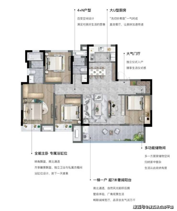 最后是建面约127㎡的四房两卫户型,拥有约4.7米宽的客厅尺度和超过7米宽的幕墙阳台,创造了豪华平层住宅的尺度感。创新的4+N户型、入户贮藏间和配备专属浴缸的全能主卧,进一步满足了高净值人群的追求。华润公元九里的高品质和各类户型选择使其成为当地的热销项目,为购房者提供了理想的居住选择。