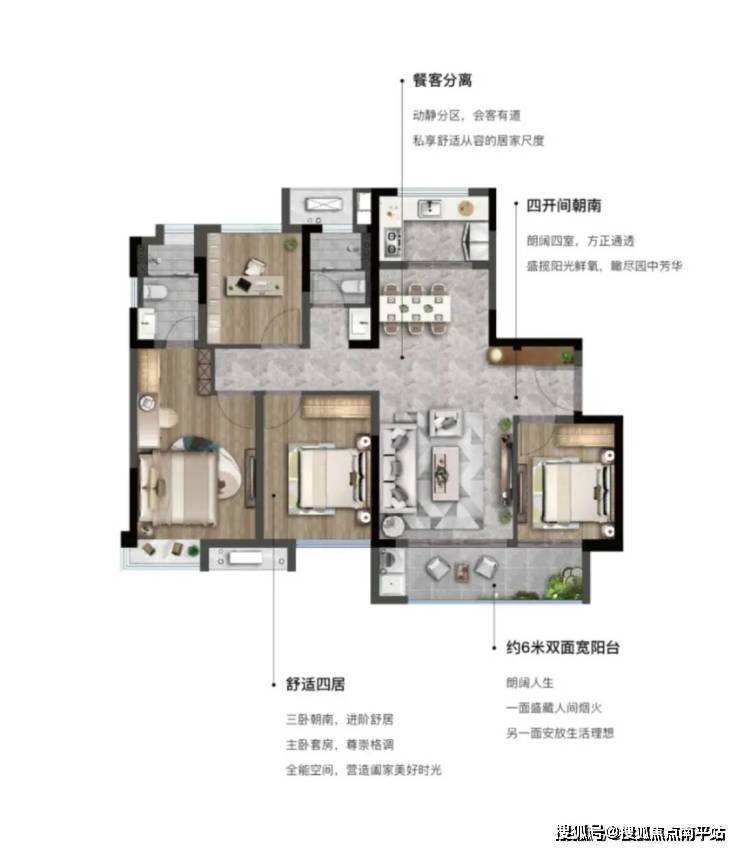 另外,建面约112㎡的四房两卫户型尤为引人注目,朝南的四开间设计使其拥有宽敞的格局。相比其他户型,该户型多出约10%的实际物理空间,配合一梯一户的尊崇设计,使其得名“洋房”,约6米的双面宽阳台和套房式主卧展现着宽敞、典雅的氛围。