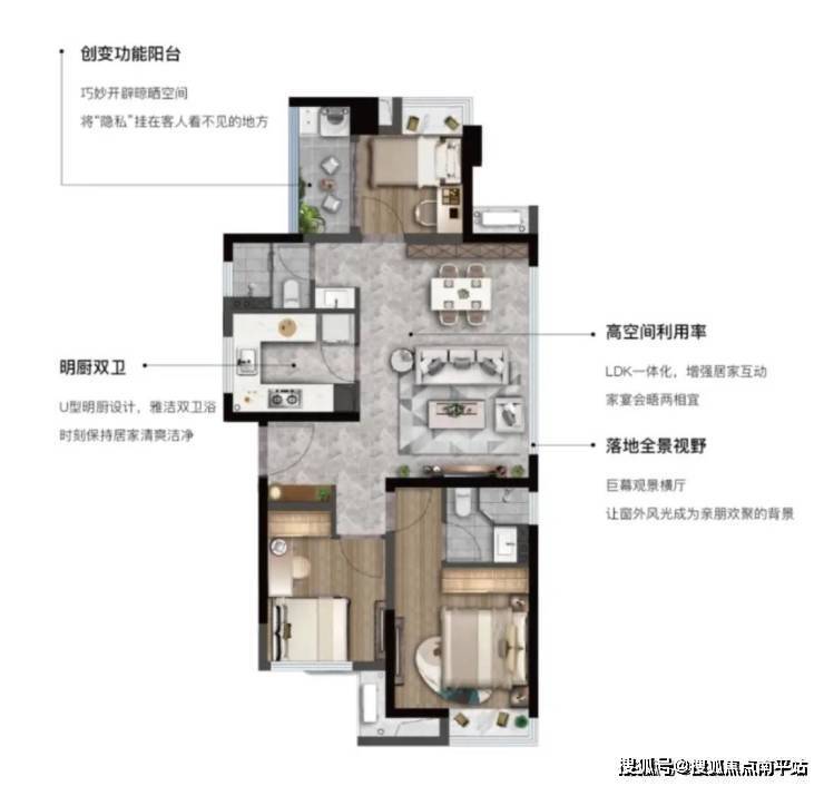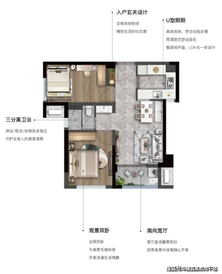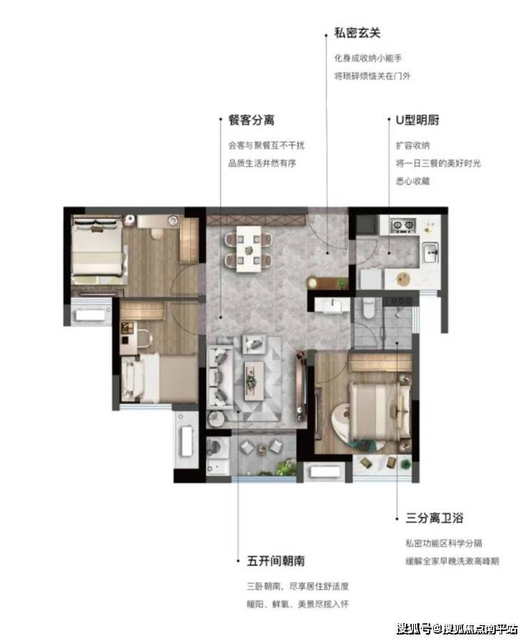 值得一提的是,公元九里推出了全新晋级的迭代户型,并精心规划了户型设计,使其在众多房源中脱颖而出。首先是63㎡的两房刚需小户型,通过多次修改和优化,推出了77㎡的三房户型,其南向五开间设计确保了极佳的采光和观景视野。独立入户玄关和零走廊设计为科学收纳和扩大生活空间提供了可能。三段式独立卫浴则能有效缓解全家“洗漱高峰期”的压力。