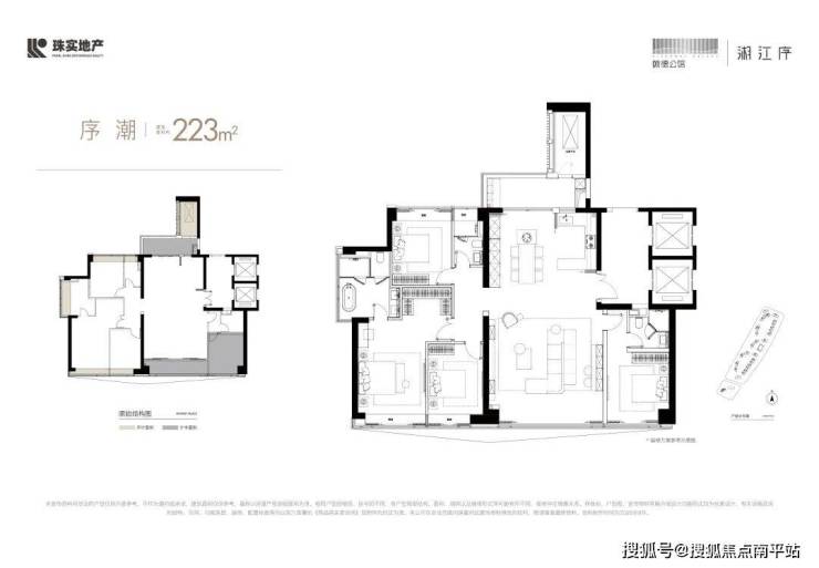 建筑面积约223㎡户型,辽阔总面宽、南向四开间、三面采光、主卧度假级套房、LDKB一体化设计等,雅契栋梁品位。