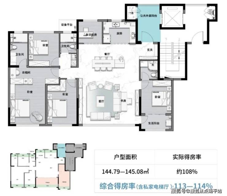 咱们重点看下洋房,观樾的洋房标准层得房率108%,算上电梯厅、阳台、花池、飘窗,综合得房率冲到114%。