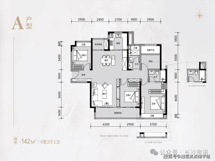 A户型-约142㎡ 馥雅四房 南北通透 LDK餐客厅一体化设计 奢阔主卧