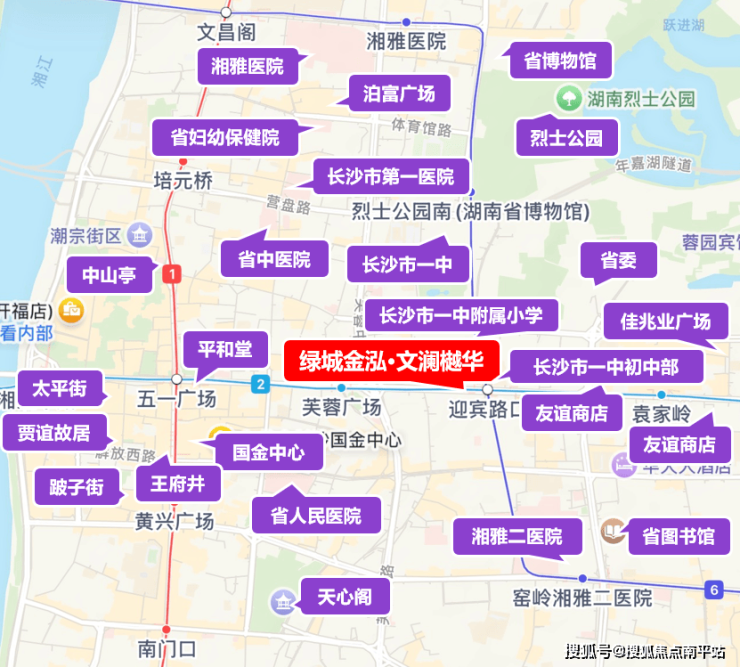 双地铁上盖:地铁2号线与6号线交汇的迎宾路口站,就在项目楼下,出小区即可进站,快速通达全城。是今年长沙市中心唯一双地铁上盖项目。