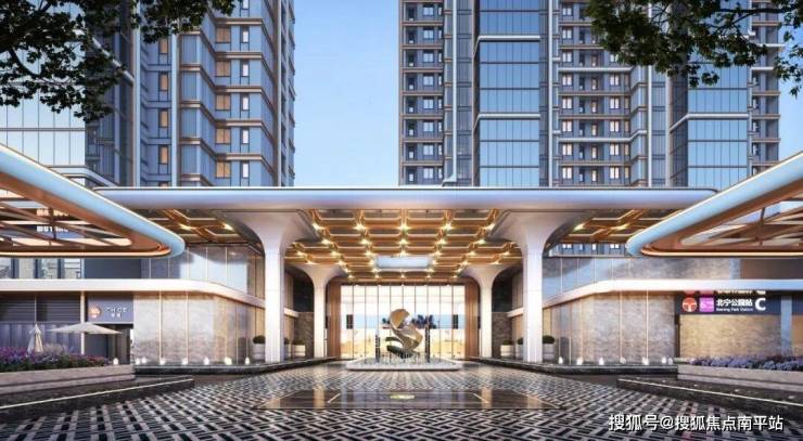 门廊下设计了一座 约500㎡的社区前院,地面铺装磨纹拼花地砖,中央点缀艺术雕塑,藻井式天花设计进一步强化入口的仪式感。