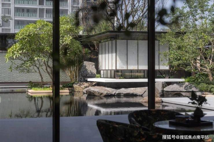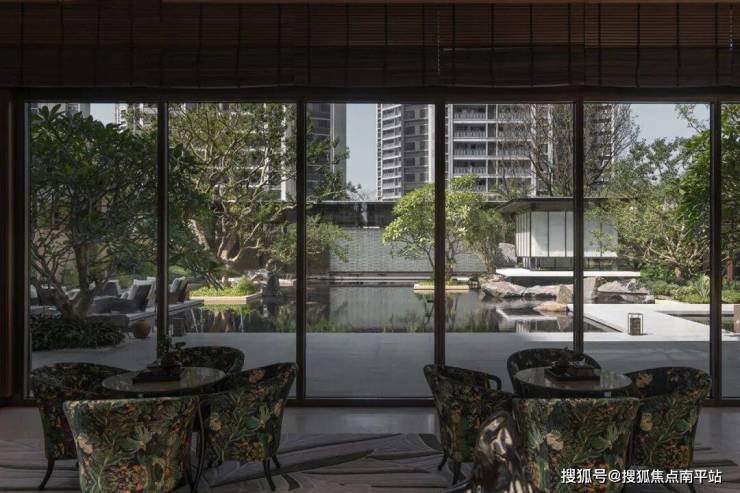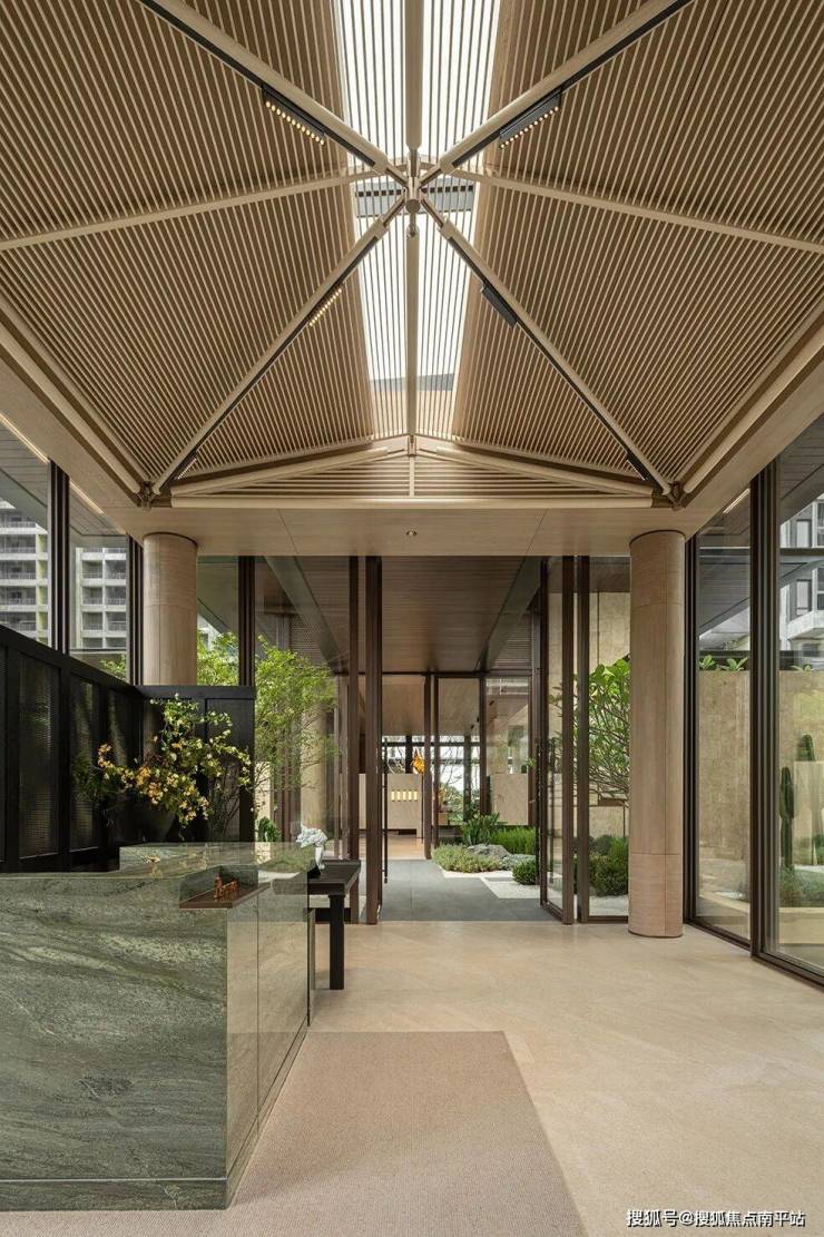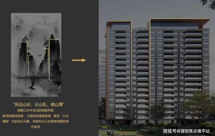 “但远山长,云山乱,晓山青” 国画山水中走出的线条风骨,极简的建筑线条,大面积的通透玻璃,配合“山水画框”式的设计元素,传统东方山水画卷构图的现代转译。