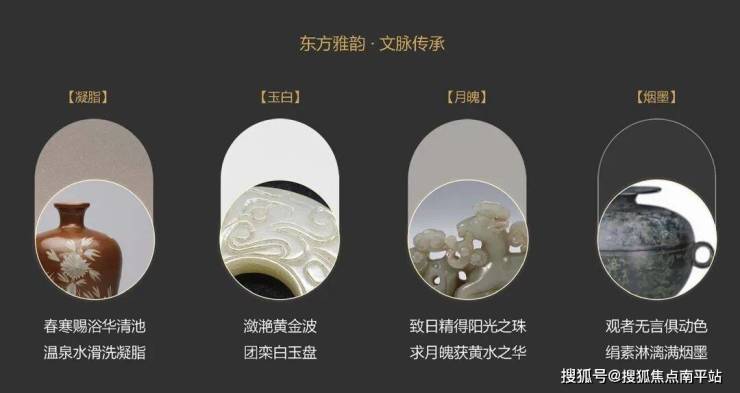古代建筑采用的色彩手法——沥粉贴金,用金属漆结合现代的工艺手法打造。建筑外形采用4种不同颜色组成鎏金水墨画卷:凝脂、玉白、月魄、烟墨,展现“素雅”的东方美学。