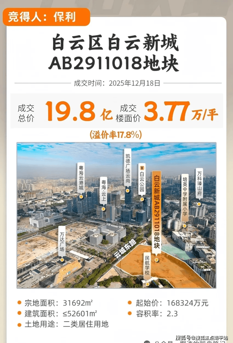 溢价17.82%,保利拿下白云区云城东路东侧地块(白云新城AB2911018地块),总价19.8亿,楼面价3.77万/平。(未扣除配建,按总建面计算)