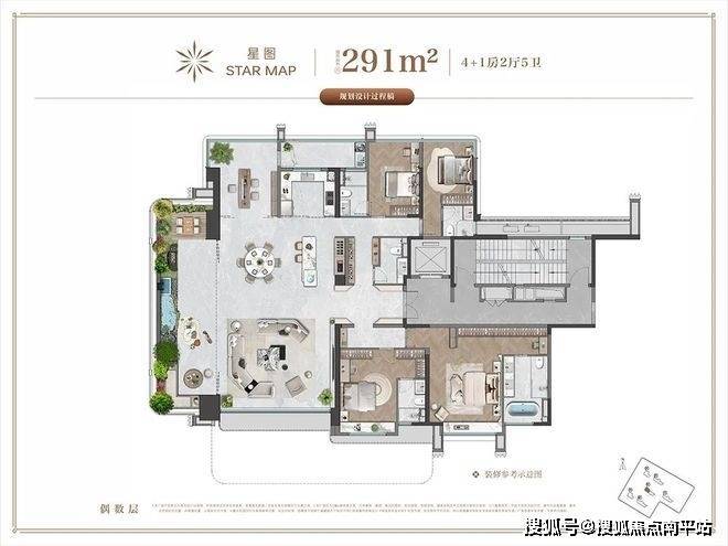 该户型建面约291 ㎡,实际可用面积达约316㎡,相当于传统住宅约390㎡居住体验。