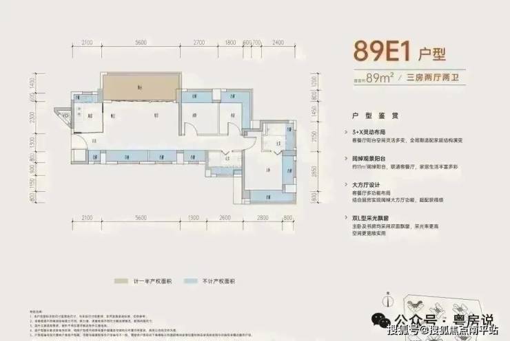 89㎡的3房2厅2卫,B户型,设计的是经典竖厅格局,进门入户玄关,客厅3.5米开间,三开间朝南,,主卧+1个次卧270°飘窗,3个卧室分别做到了主卧15.1㎡/次卧8.52㎡/次卧7.77㎡(包含墙体飘窗),得房率约:77.39%(不含赠送),西南朝向。赠送面积16.96㎡,加上赠送得房率96.84%。