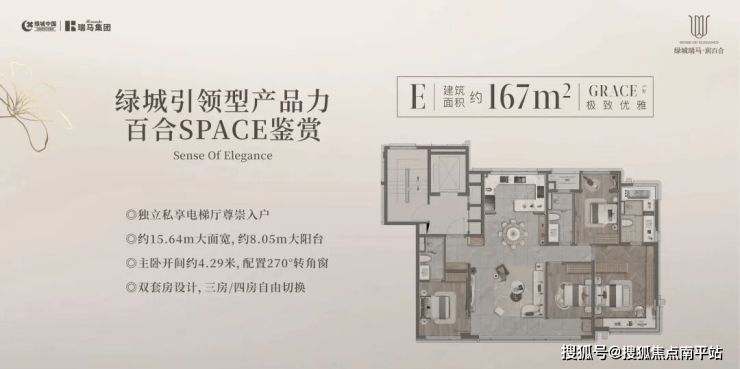 167㎡三/四室:私享电梯厅;约15.4米面宽,约8.05米阳台;主卧开间约4.29米,270度拐角窗;双套房。
