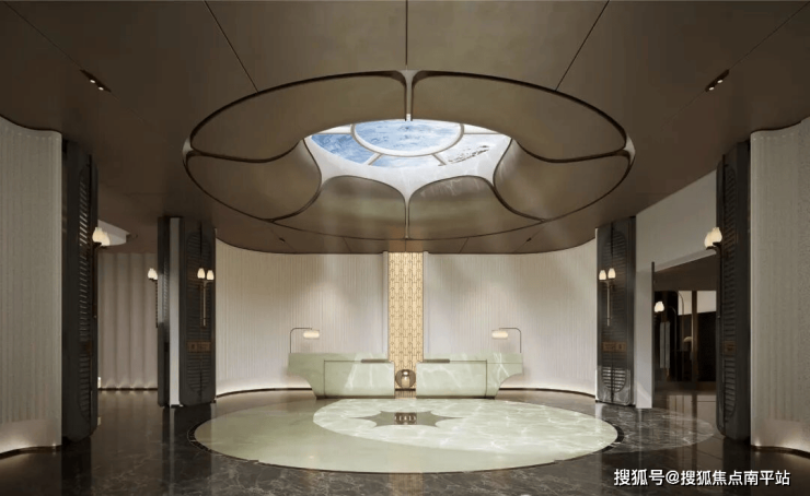 ▶ 奢配恢宏穹顶光瀑的百合光厅:模拟百合花卉之形,青玉与深古铜不锈钢天花,辉映璀璨天光,自成通透无垠之境