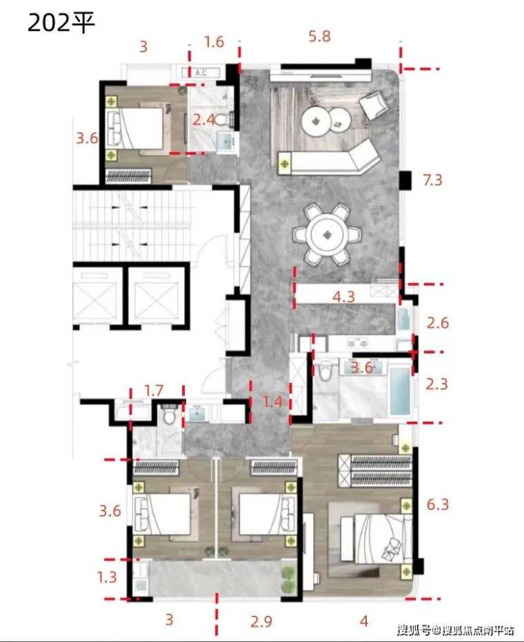 202平,4房-3卫,合计86套,占6.8%。