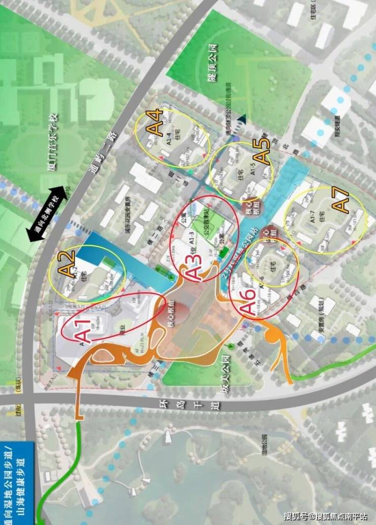 A1、A3商业、办公楼、及公寓;而A6一半是商业另一半则是商品房住宅;A2、A4、A5、A7为纯住宅地块。