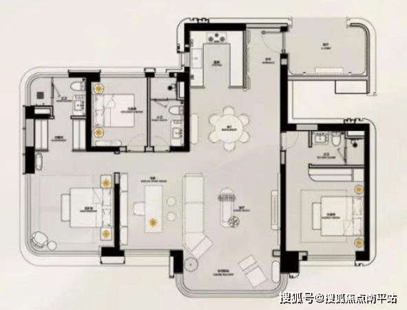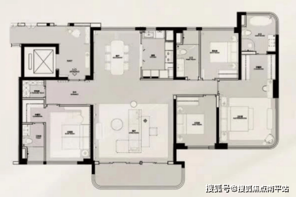 建面约140㎡的四房两厅三卫,独立电梯间,双主卧套房。