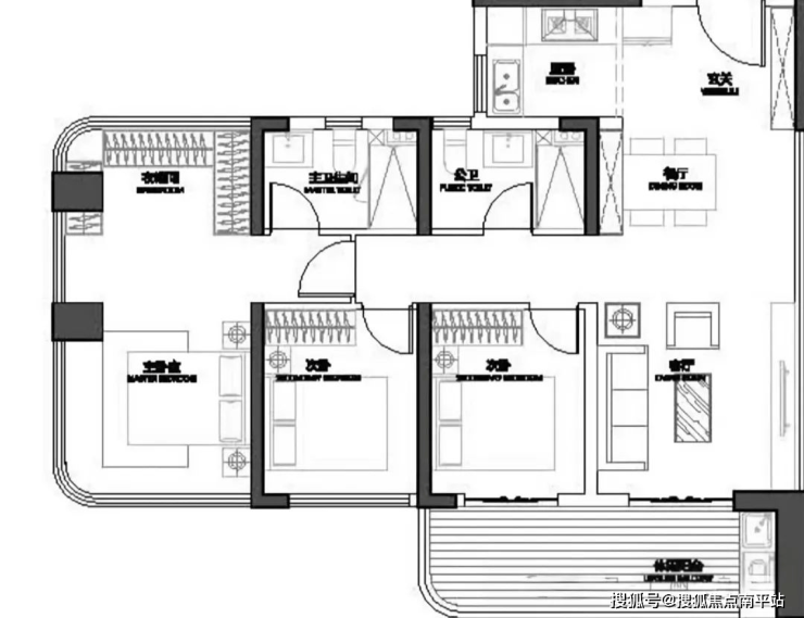 建面约90㎡的三房两卫,竖厅设计,客厅3.4米面宽,南向大阳台。