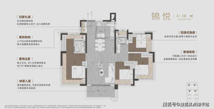 先说建面约111㎡户型,属于市面上少有的四房产品,比同类产品多一房,小编总结出几个户型看点: