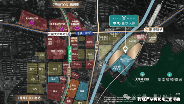中建翡翠天序,北侧距城铁湘府路仅200多米,步行轻松抵达;距7号线红星大市场站(建设中)约300米,未来有8号线(规划中)与7号线在此换乘。