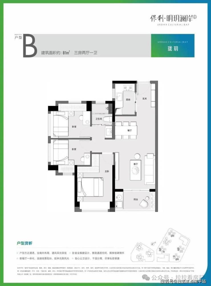 83㎡的3房2厅1卫,设计的是竖厅格局,客厅3.4米开间,LDKB一体化设计,进门独户玄关,动静分区,U型厨房,卫生间三段式分离,得房率:75.6%(不含赠送),阳台有西南向、东南朝向或朝西向。