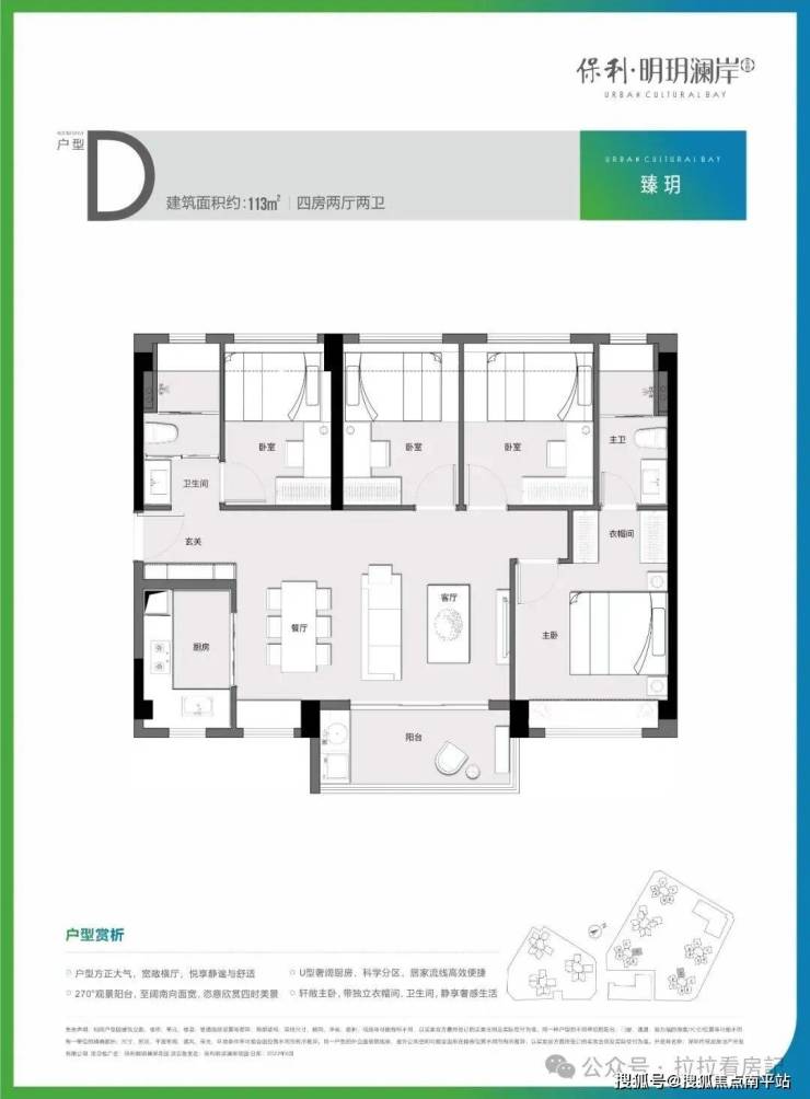 113㎡的4房2厅2卫,设计的是横厅南北通透格局,客餐厅6米开间,进门独户玄关,主卧大套间,U型厨房,公卫三段式分离设计,得房率:77.57%(不含赠送),阳台主朝西南向、东南向或正南向。