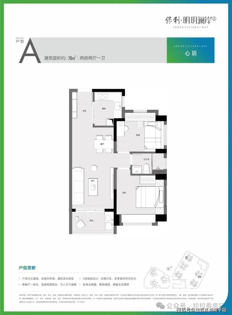 71㎡的2房2厅1卫,设计的是竖厅格局,客厅3.2米开间,LDKB一体化设计,进门独户玄关,U型厨房,卫生间干湿分离,得房率:75.61%(不含赠送),阳台有西南向、东南朝向或朝西向。