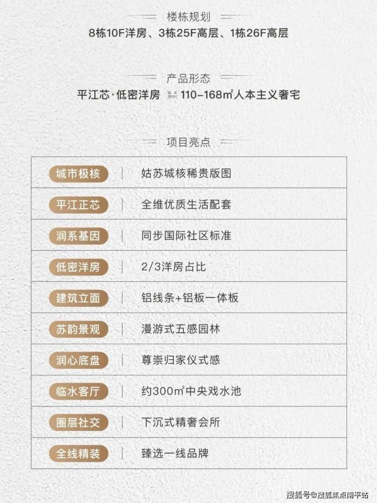 择址平江新城,姑苏新中心,润宸借鉴国际社区设计理念,规划12栋住宅,其中8栋约168㎡低密洋房、4栋约110㎡/144㎡光幕高层,凭借润系高阶作品对国际新锐生活的理解,以镜面美学立面、苏韵园林景观、万象服务产品服务力、润心会所文化、匠心精装产品,打造与平江共赴新的国际轻奢改善住区