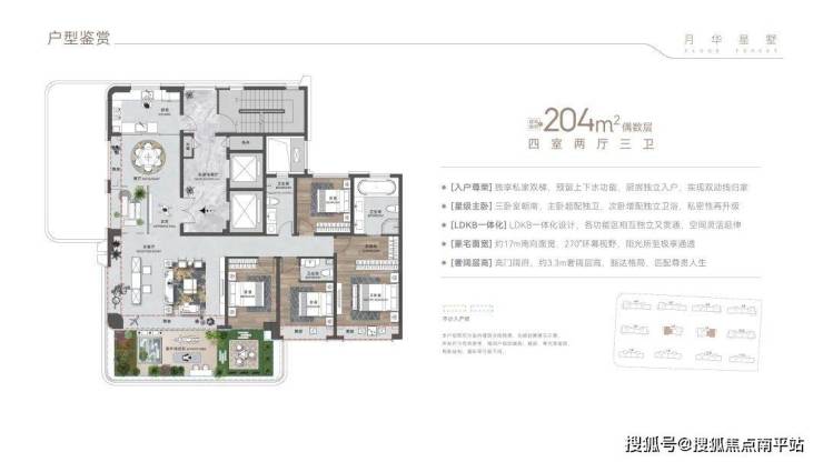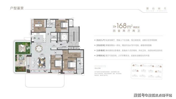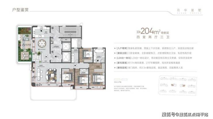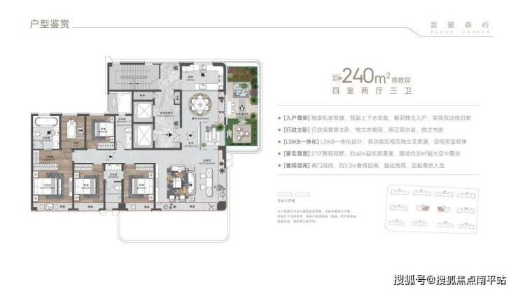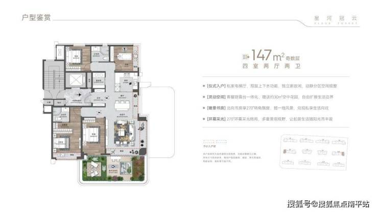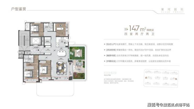 168-240㎡空中院墅:创新引入“双首层”概念,通过错层设计实现 6.5米挑高客厅,部分户型配备 270°环幕露台,将庭院概念引入空中。