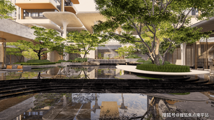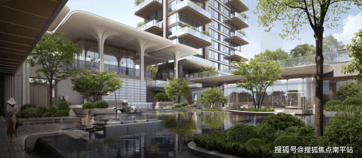 更值得一提的是社区整体抬高 6.5 米的巧思设计:既巧妙隔绝了城市道路的嘈杂,又借助叠水景观与下沉庭院形成的垂直落差,营造出 “山在城中矗立,城融园中生长” 的沉浸式意境,让居者随时感受自然与生活的交融之趣。