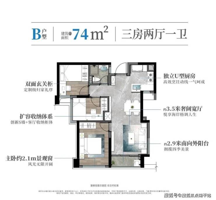 比二期77㎡户型少3㎡,实用面积不减,直接省出半个车位钱!客厅约3.5米+阳台约2.9米+主卧落地窗,采光超棒;客厅S墙+收纳柜,让收纳直接拉满,厨房还贴心预留双开门冰箱位。