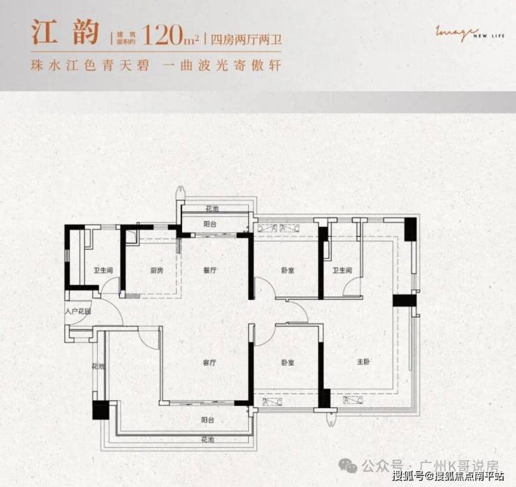 建面约120㎡:四房两厅两卫设计,四开间朝南,居住与生活动静分离,南向大阳台或南北双阳台,主卧带270°飘窗。